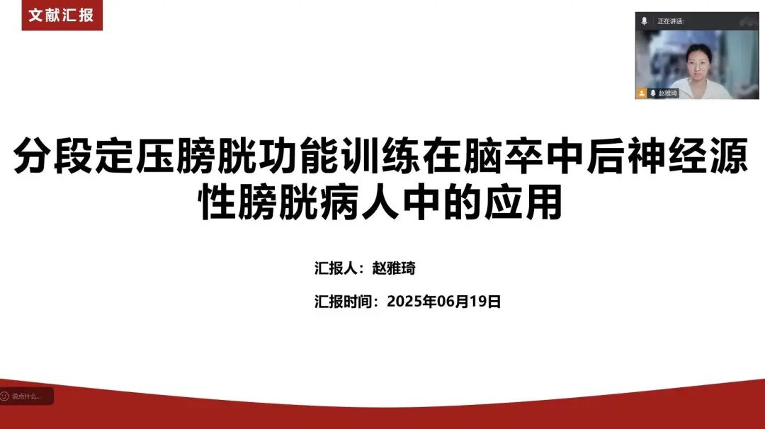 赵雅琦详细介绍了分段定压膀胱功能训练通过模拟膀胱生理周期,显著改善脑卒中后神经源性膀胱患者的膀胱功能、减少残余尿量、降低尿管重置率和尿路感染率,并缩短置管时间,效果优于传统方法。该方法可临床推广,未来需扩大样本及多中心验证。