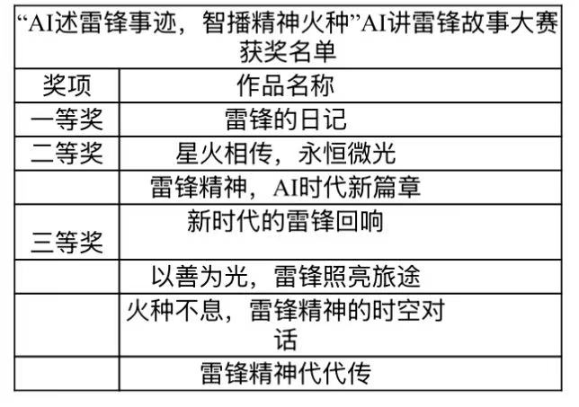 AI讲述雷锋故事活动中,选手们运用AI技术生动形象的展现出雷锋的相关事迹。最终共有七个优秀作品脱颖而出。他们将现代技术与雷锋精神结合,使雷锋精神在新时代焕发出新的生机与活力。