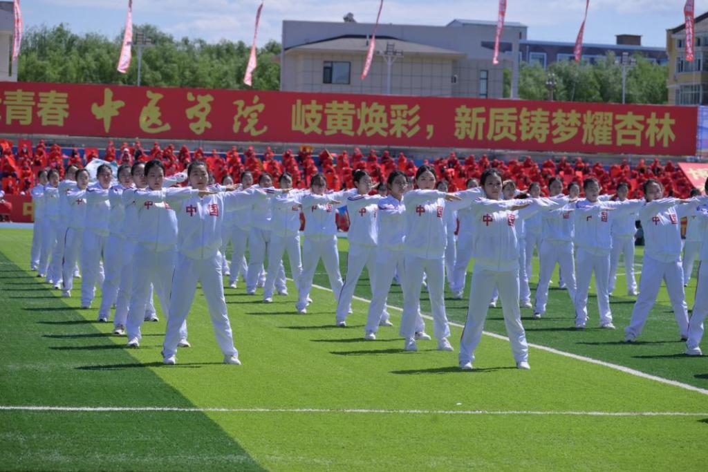 在太极拳和广播操表演中,同学们动作行云流水、整齐划一,将力与美完美融合,赢得现场阵阵掌声。