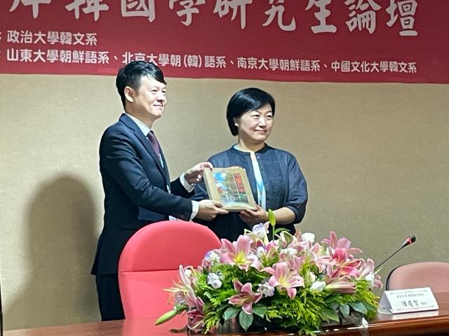 本次论坛由开幕式、四场主题发表、闭幕式等六部分组成。开幕式由台湾政治大学韩国语文学系陈冠超老师担任主持,系主任陈庆智老师致欢迎辞。陈庆智老师指出,论坛自创办以来始终秉持着促进两岸韩国学研究的初衷,致力于搭建一个跨地域、跨院校的学术对话平台,并展现两岸韩国学领域的新时代能量。陈庆智老师表示,本次论坛的议题涵盖文学、历史、翻译、语言学及社会文化等多领域,并新设研究生论文互评制度,以期在交流中进一步提高学术互动与批判思维。致辞结束后,陈庆智老师向与会各系赠送礼物,jinnianhui金年会登录入口副院长王丹老师亦代表jinnianhui金年会登录入口朝鲜(韩国)语言文化系向台湾政治大学韩国语文学系赠送纪念品。
